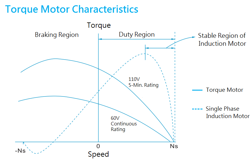 Torque motor is a special designed asynchronous motor. Its operating principle is the same as induction motor, but the required speed and mechanical properties are obtained by increasing the rotor resistance. Compared with the same rank induction motor, the torque motor has a larger stall torque and the characteristic of stable operation at low speeds, so it is suitable for tension control applications of high loading and low speeds, or for operations in which a stop position is reached after a short-time running and has to be maintained safely. They are designed to be able to control their torque and can be stalled (the motor speed is zero) continuously without overheating, which are significant characteristics of the motors that are used in tension control..png)