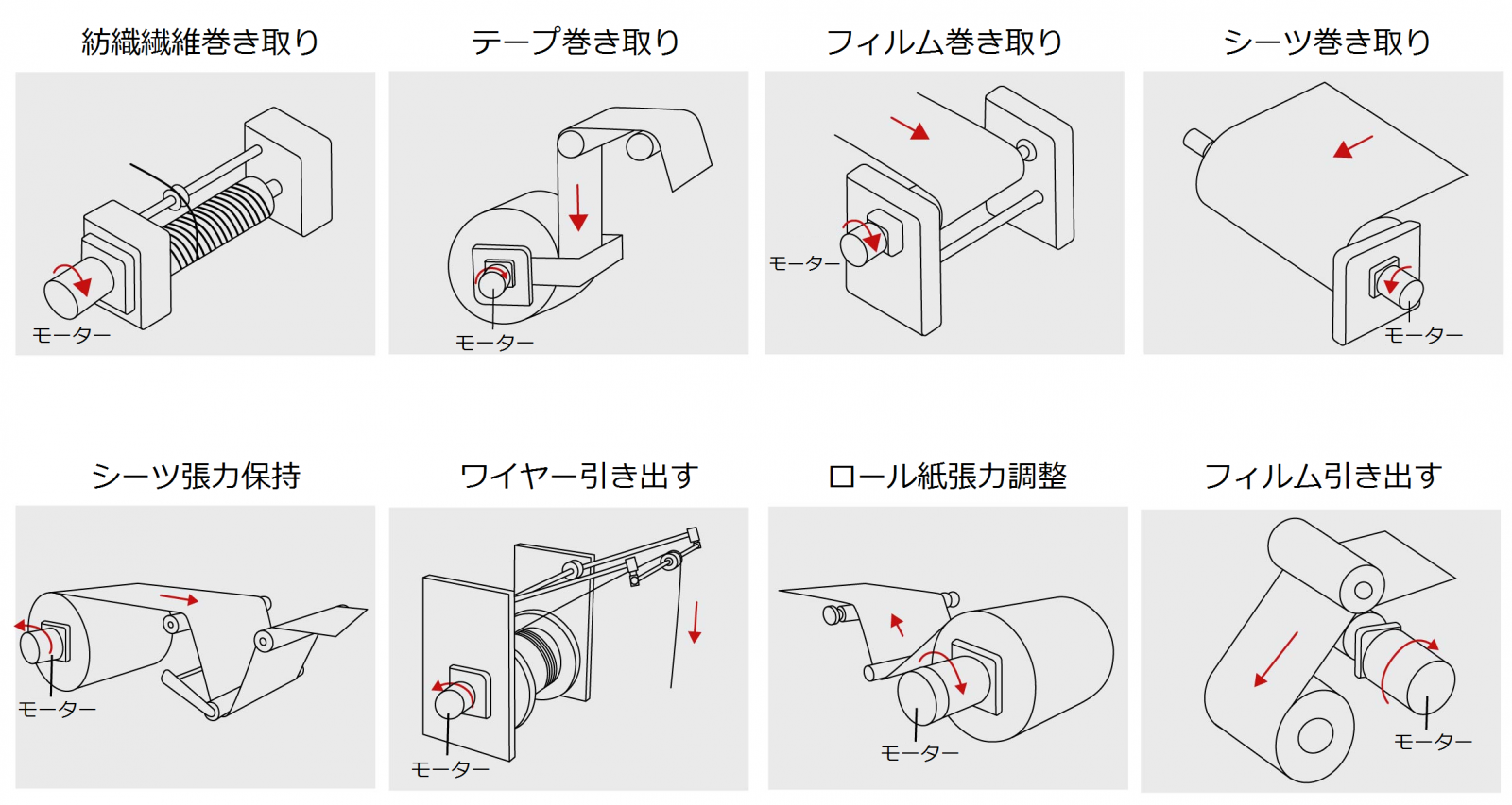トルクモーターは、製造工程でテンションコントロールに使用されることが多く、これは比較的まれですが、広範囲のモーター用途において重要な用途です。テンションコントロールとは、シートやフィルム状の素材、ケーブルやワイヤーなどの製品の連続長さをコントロールすることで、製品の厚みや伸びをできるだけ一定にコントロール・維持するためには、製品に一定のテンションを持たせる必要があります。 たとえば、ロール紙、フィルム、プラスチックフィルム、ワイヤー、ウェビングの巻き取り力や引き伸ばし力のコントロール。 巻き取りや巻き戻しの際に製品を整列させるだけでなく、しわや破損を防ぐのにも役立ちます。