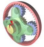 如圖所示,行星減速機內部結構,主要由四個部分組成。分別是太陽齒輪(Sun Gear)、行星齒輪(Planetary Gear)、環齒輪(Ring Gear)以及行星臂架(Carrier)。在這個齒輪系中,外圍的環齒輪固定不動,經由馬達驅動的太陽齒輪位於輪系的中心,也就是輸入軸。太陽齒輪被馬達驅動,同時移動固定在行星臂架中的行星齒輪。行星齒輪除了本身自轉外,也繞著太陽齒輪的軸線進行公轉。行星臂架本身也就是減速機的輸出軸(或稱為出力軸)。行星齒輪運轉的同時,也將馬達的動力經由行臂架傳輸出去。這個齒輪系的運轉類似於太陽系中行星的軌道運行,行星齒輪系就是這樣得名的。以這種結構所製作的減速機,即稱為行星減速機。