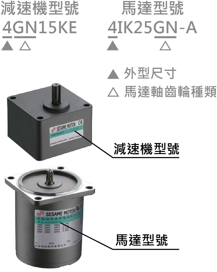 AC小型標準馬達的輸出軸有圓軸與齒輪軸兩種,只有齒輪軸才能夠與減速機組裝。依據馬達與減速機的型號,「外型尺寸」與「馬達軸齒輪種類」兩者的型號一致時,即可組合。故訂購或安裝前請先核對確認馬達與減速機的型號,否則無法組裝。組裝時,如果減速機與馬達軸不能順利囓合時,請一邊輕輕的左右轉動減速機,同時一邊組裝。