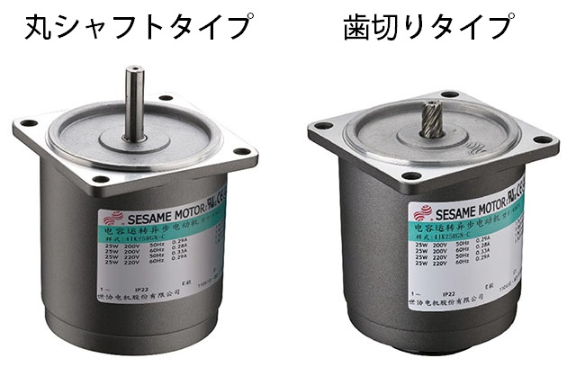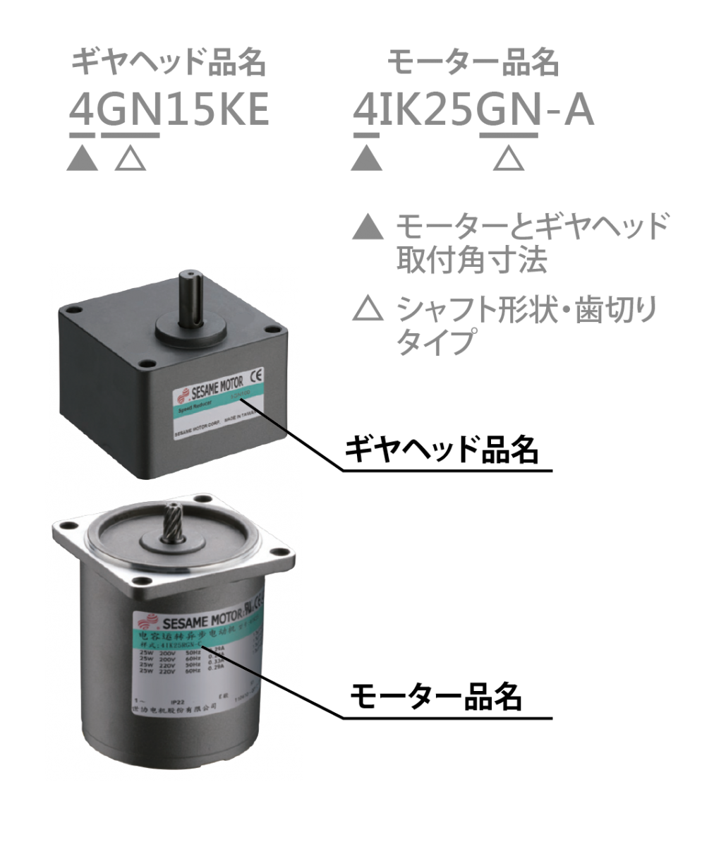 AC標準モーターのシャフト形状には、丸シャフトタイプと歯切りタイプ(ピニオン)の2種類があり、歯切りタイプ軸付きモーターのみギアヘッド(減速機)との組み付けが可能です。コンビタイプ(モーターとギヤヘッド組み付け済み)のモーターとギアヘッドの品名によっては、「取付角寸法」と「歯切りタイプ」が一致すれば、組み合わせることができます。したがって、注文して取り付ける前に、モーターとギアヘッドの品名を確認してください。モーターとギアヘッドがスムーズにかみ合わない場合は、ギヤヘッドをゆっくり左右に回しながら組み付けてください。
