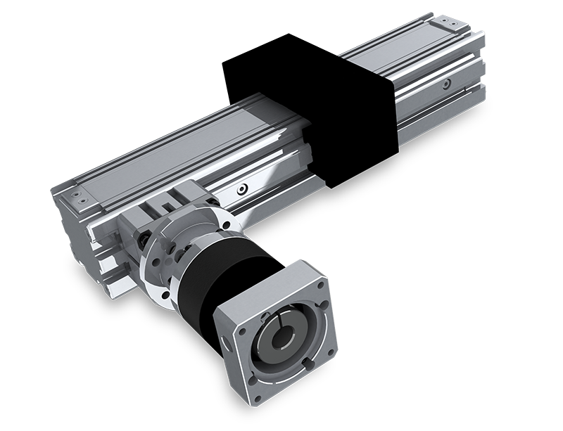PGW中空輸出軸行星減速機與線性致動器或單軸機器人的安裝示意。 減速機與和線性致動器輸入軸之間需要額外的聯軸器或安裝法蘭。馬達連接板尺寸依據伺服馬達法蘭尺寸訂製,適用各廠牌伺服馬達。