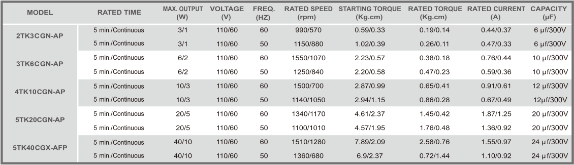 | 5TK40GX-AFP | 5GX□KB | 5 min. / Continuous | 40 / 10 40 / 10 |