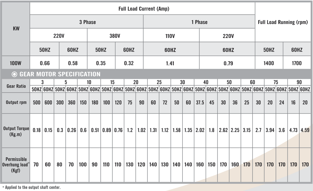 Foot Mounted Gear Motors SpecificationsG11H100, Output 100W (1/8 HP)