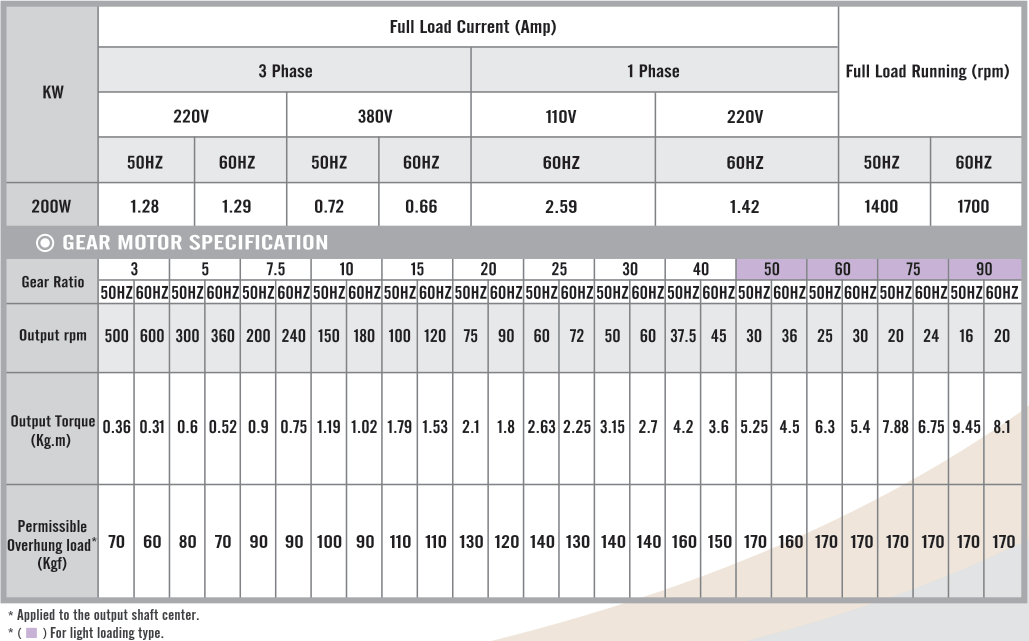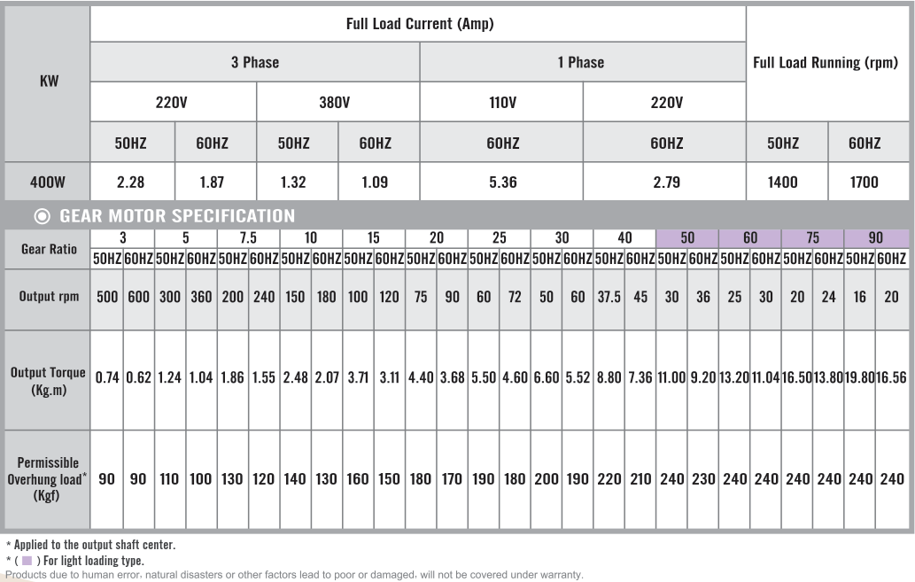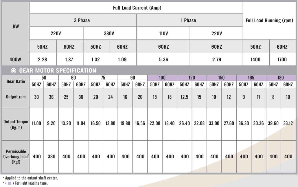 Foot Mounted Gear Motors SpecificationsG12H400, Output 400W (1/2 HP)