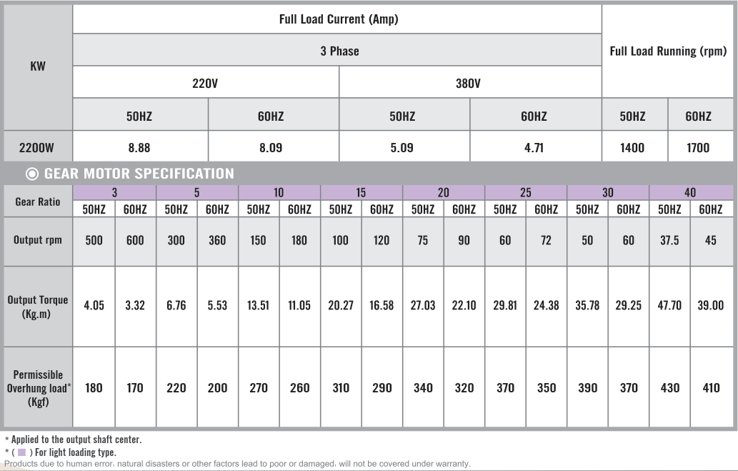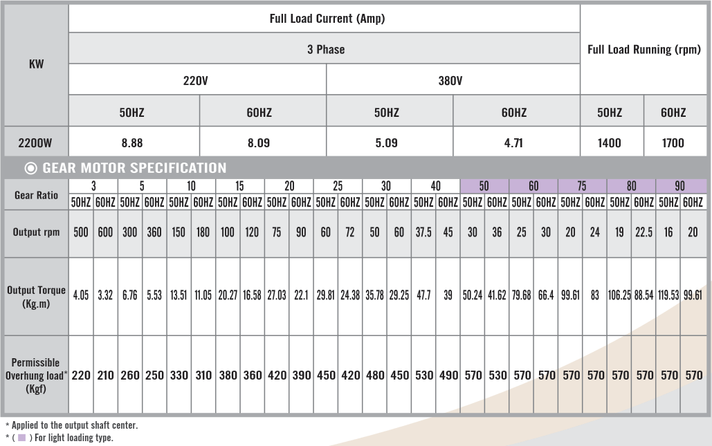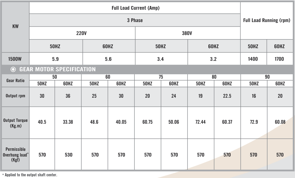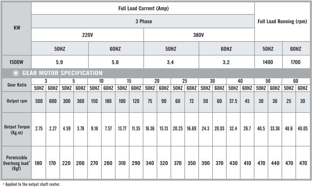 Foot Mounted Gear Motors SpecificationsG14H1500, Output 1.5kW (2 HP)