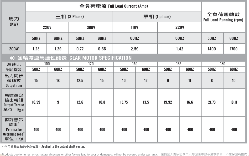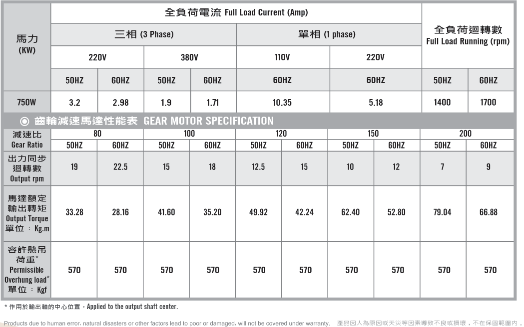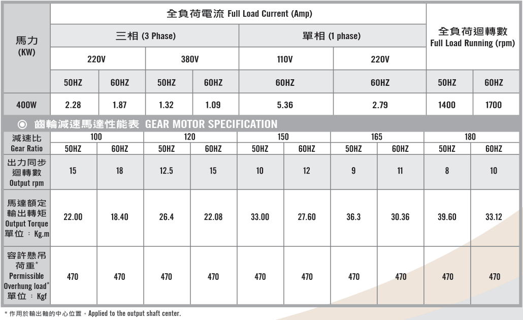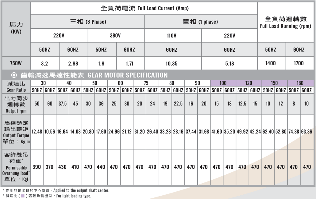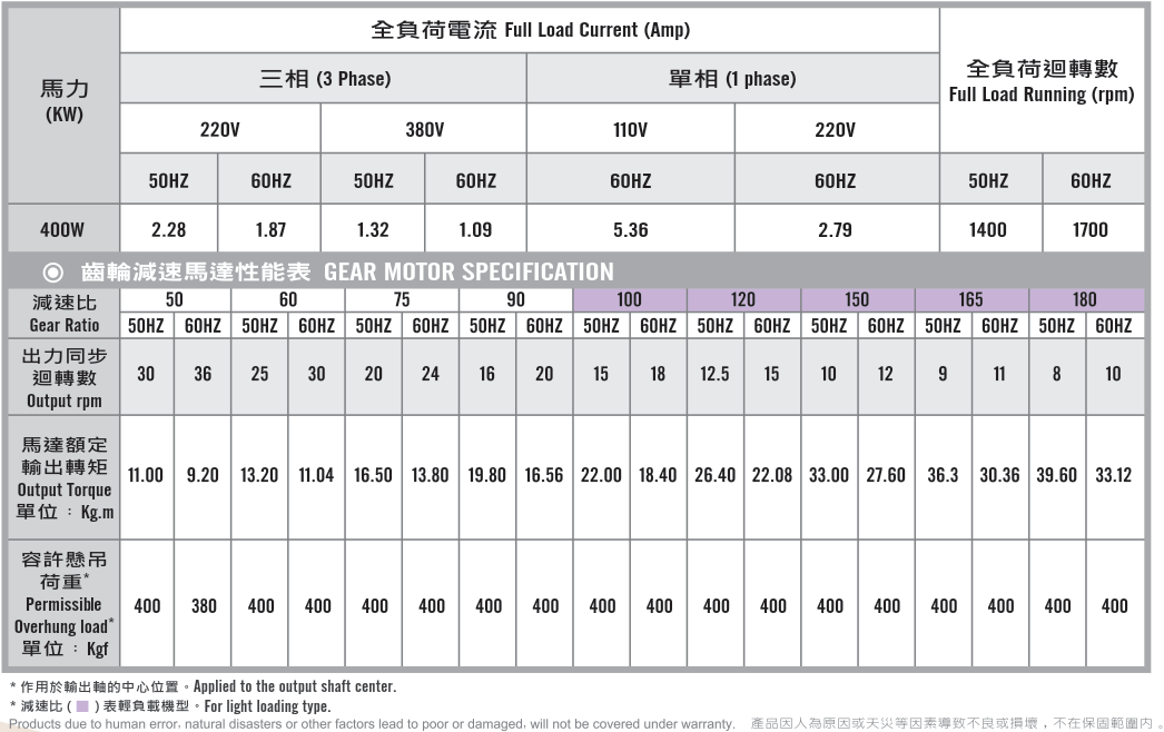 立式齒輪馬達/減速馬達性能規格表G12V400,400W (1/2 HP)