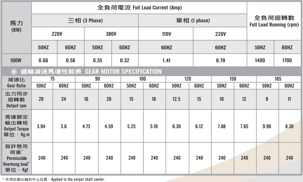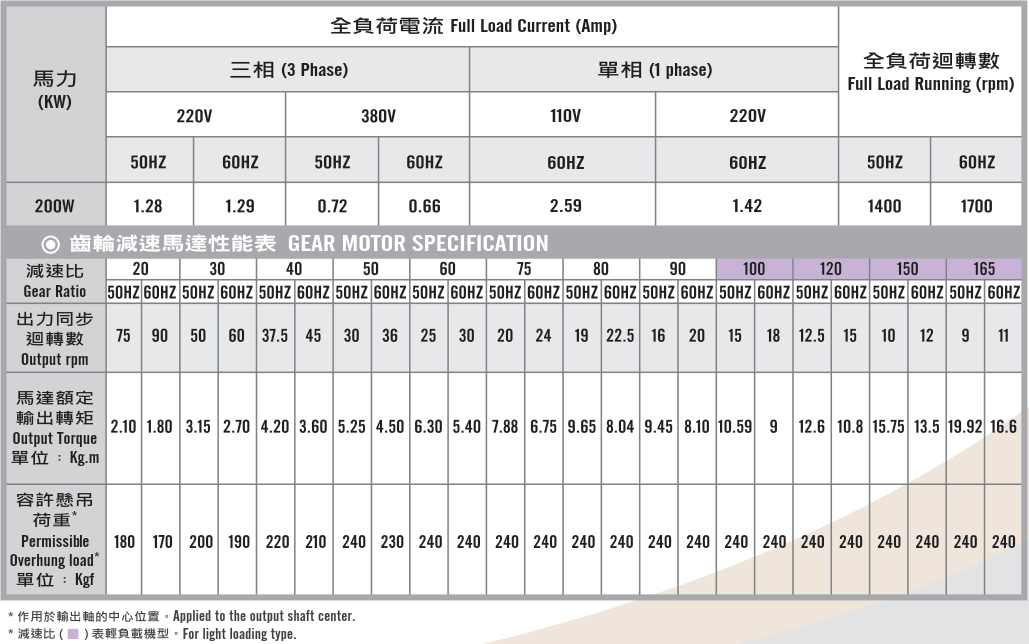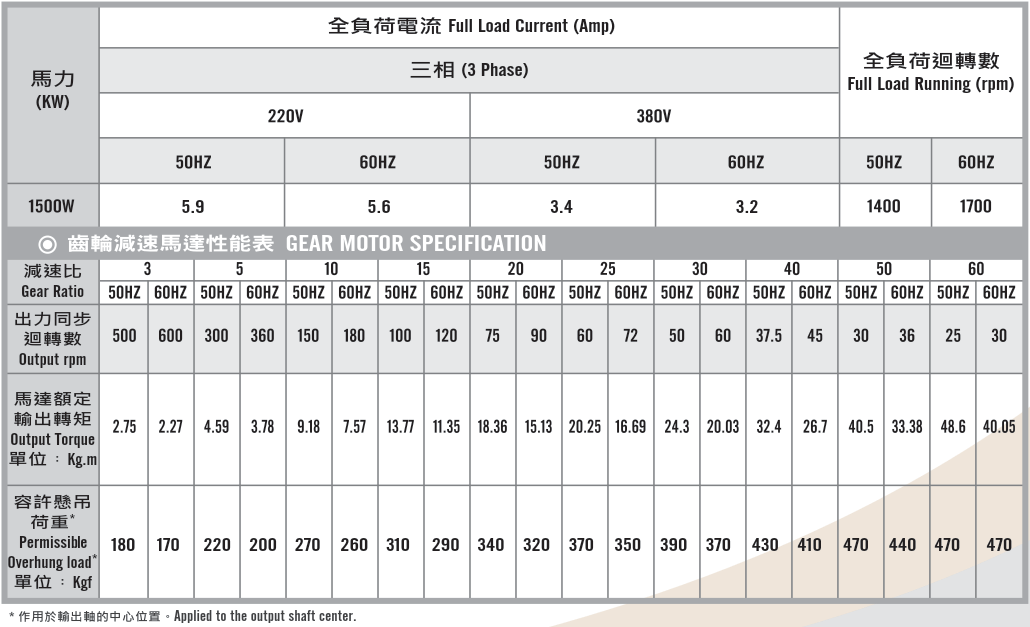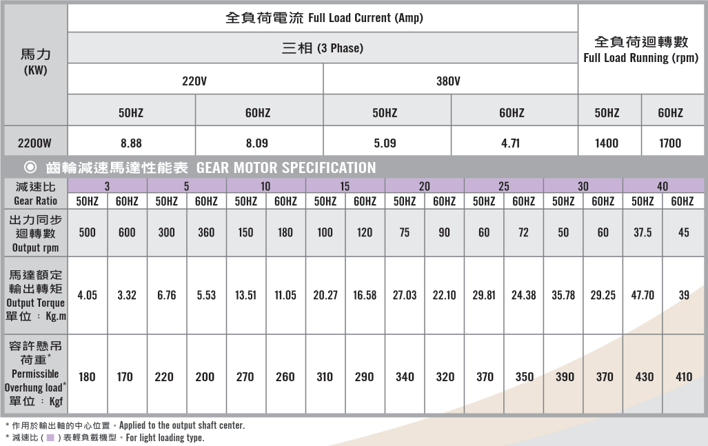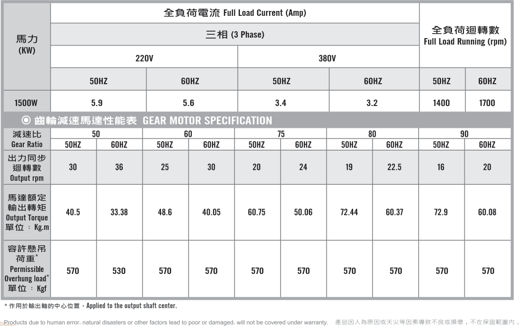 立式齒輪馬達/減速馬達性能規格表G12V400,400W (1/2 HP)