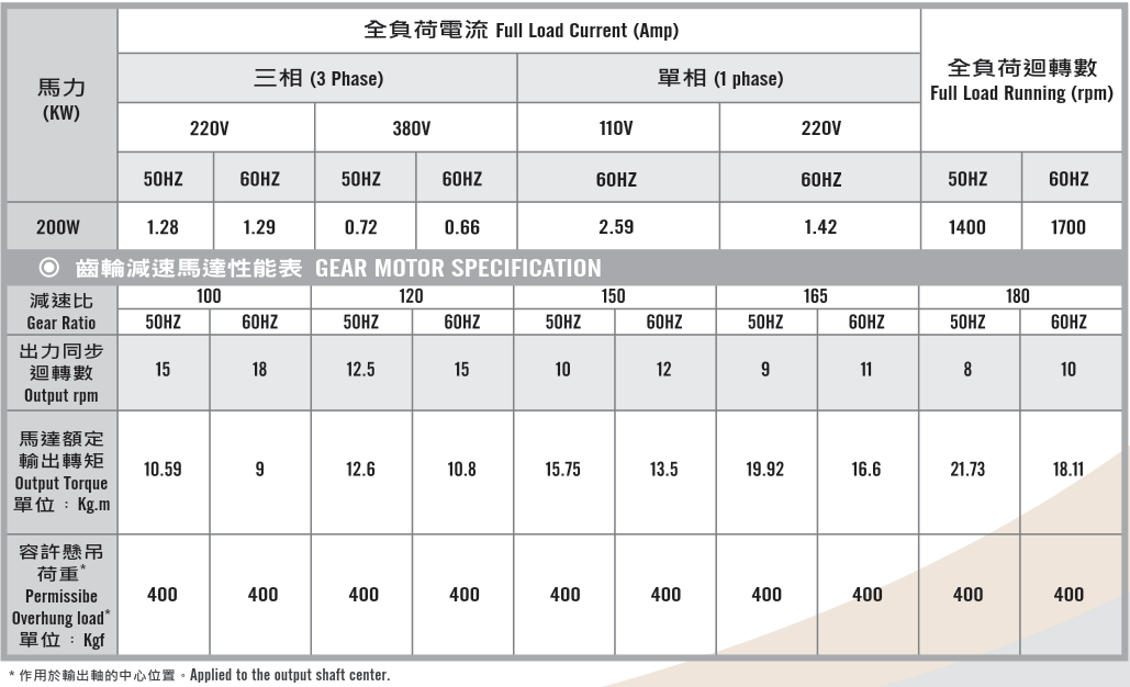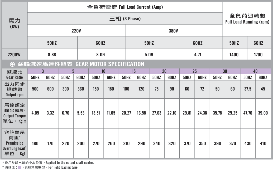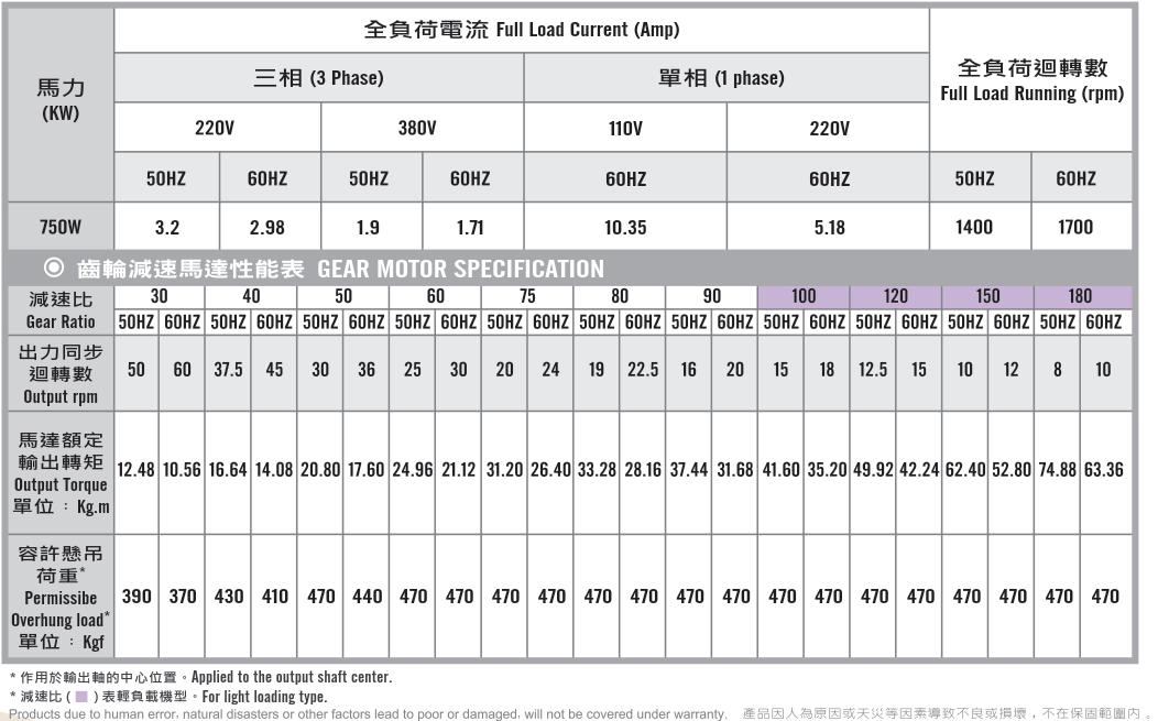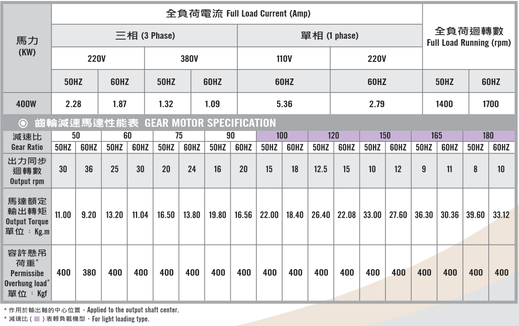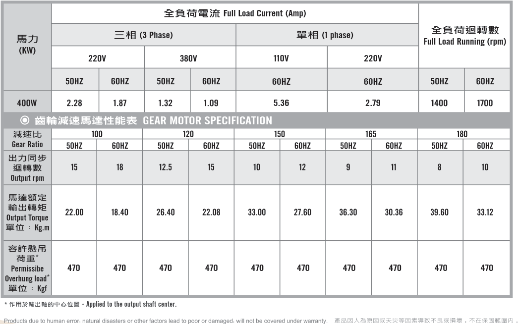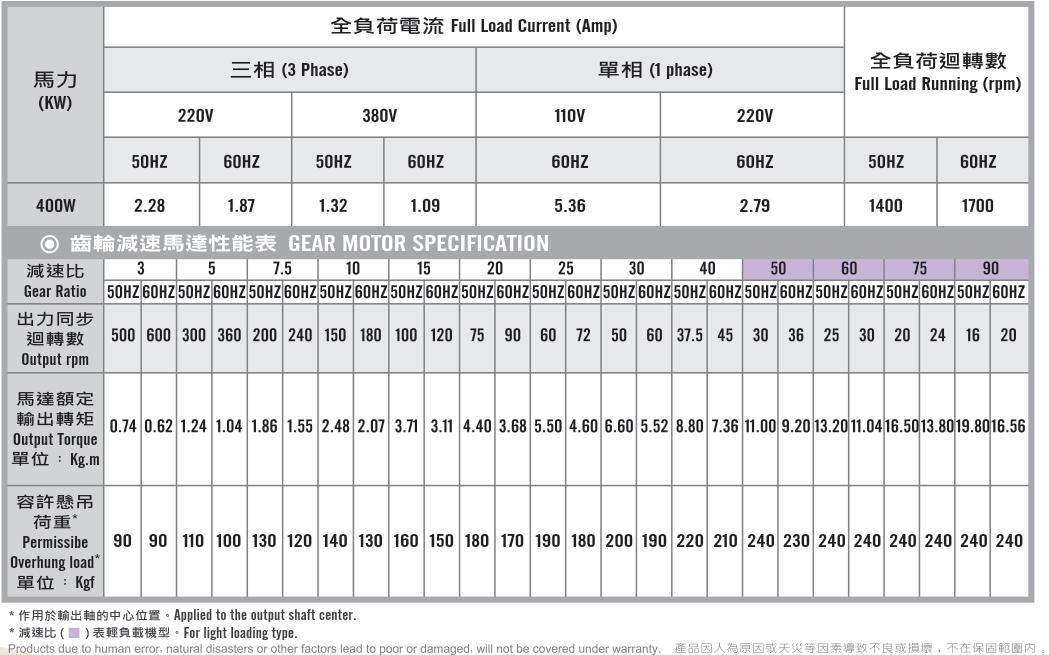 臥式齒輪馬達/減速馬達性能規格表G12H400,400W (1/2 HP)