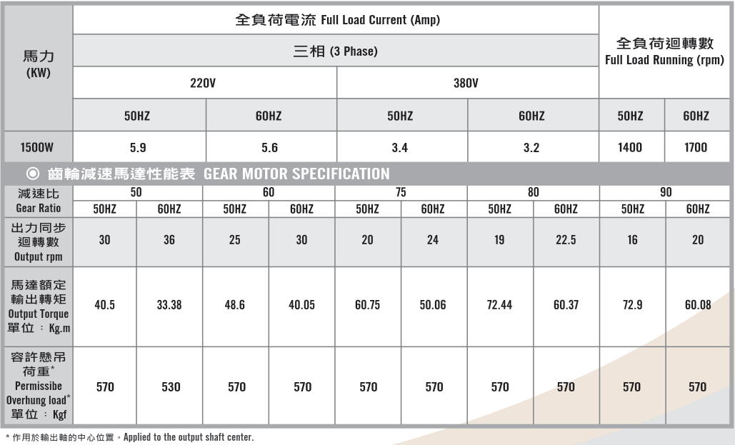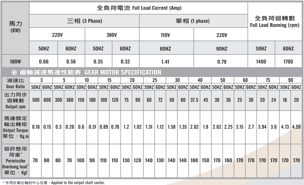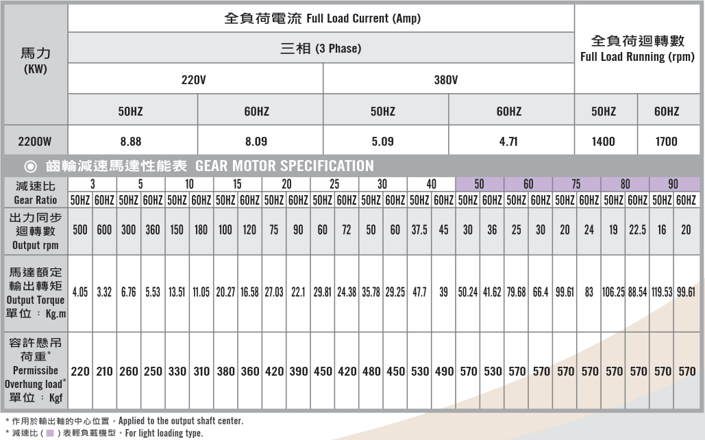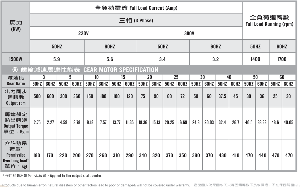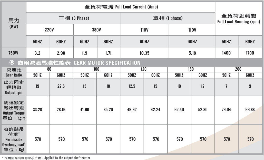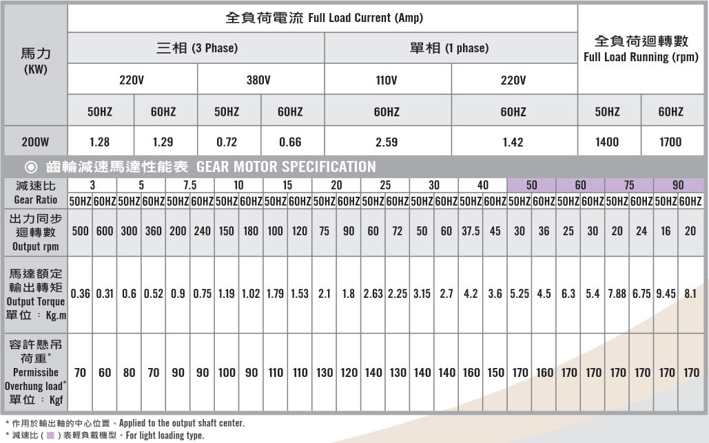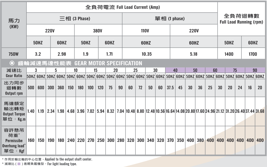 臥式齒輪馬達/減速馬達性能規格表G12H400,400W (1/2 HP)