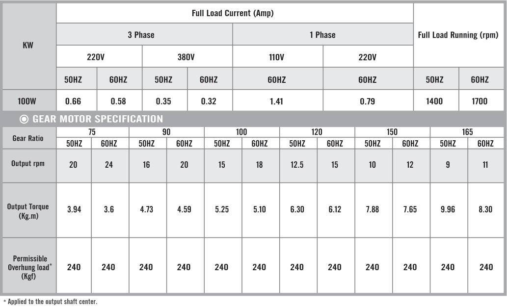 Foot Mounted Gear Motors SpecificationsG11H100, Output 100W (1/8 HP)