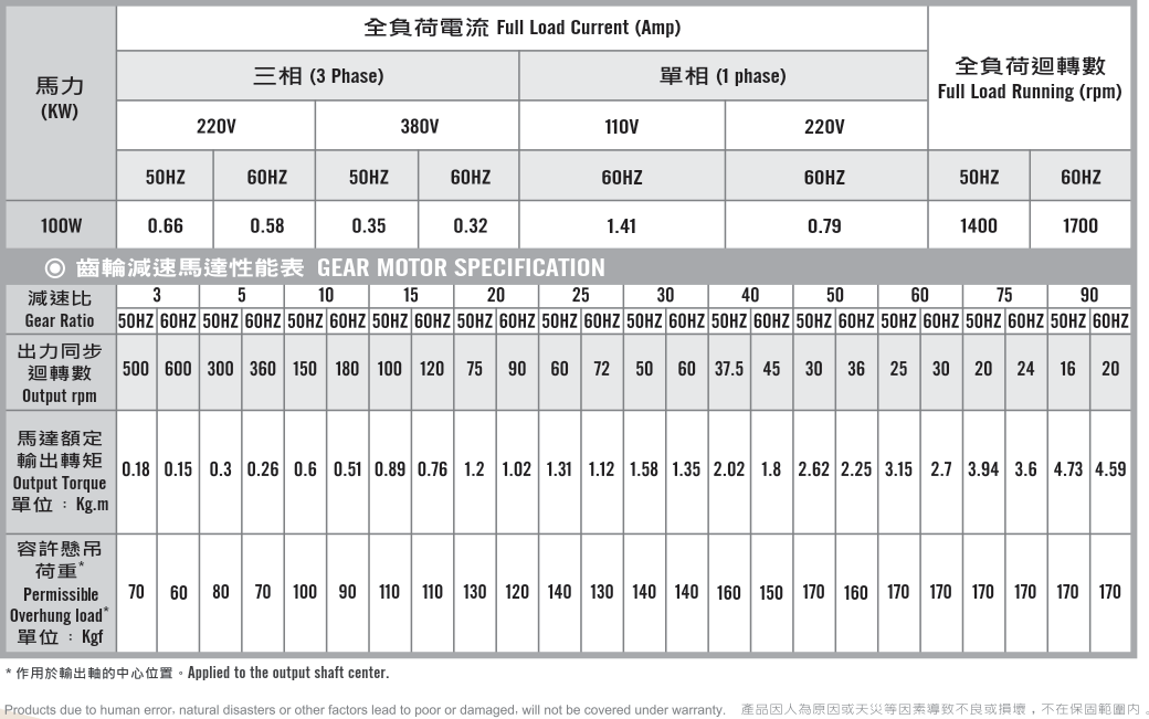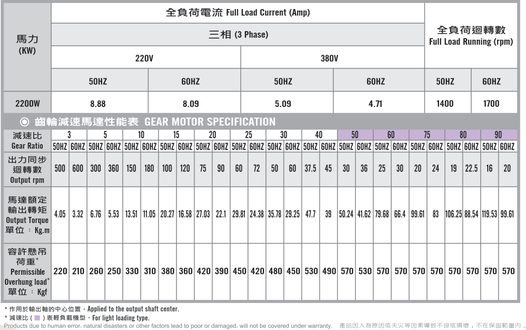 立式齒輪馬達/減速馬達性能規格表G12V400,400W (1/2 HP)